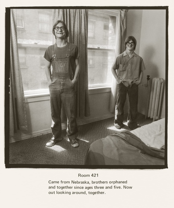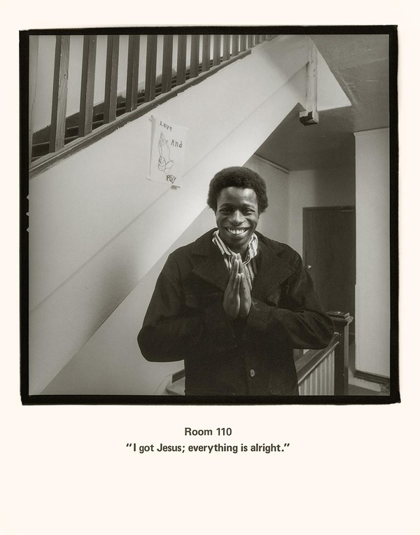 When Penny Wolin created Guest Register in 1975, she was twenty-one and a recent transplant to Hollywood from Cheyenne, Wyoming. You can see the residents of the St. Francis Hotel as people who could not fit in elsewhere, or you can see them, as Wolin does, as people whose dreams are bigger than their rooms. She moved into the 1920s hotel, a five-story pay-by-the week building on Hollywood Boulevard and began photographing her neighbors. She could see at once it was a “milieu of dreamers,” both those who “had not yet realized their dreams” and those who “had left them behind.” Wolin suspended judgement. She was not categorizing the residents as she made her rounds, and her project was not intended to fix anything. This generosity of spirit is the defining quality of Guest Register. The book is arranged as a tour, one image per spread, with residents identified by their room number and an insightful caption. The tour begins on the ground floor in room 105, vacated by the death of a former stuntman, and rises to a barbell aficionado in the penthouse, before returning to earth by way of an artisan welder in the basement, who seems to have lit his cigarette with a flaming torch. Guest Register is a both a culmination and a relaunch for an endeavor that is about the possibility of a second chance for all of us.