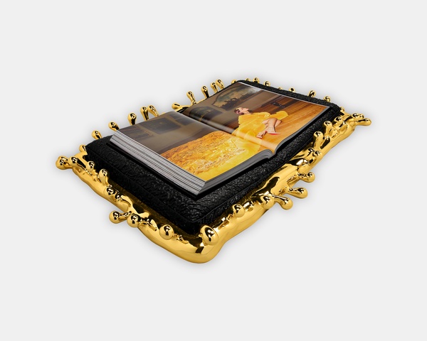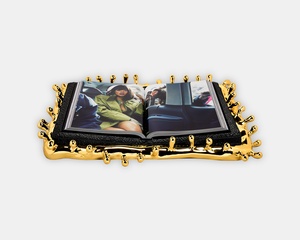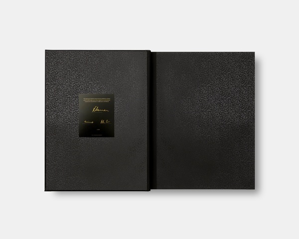 This edition is bound in a bespoke black fabric with a matte black, laser-cut, steel logo inset into the front cover, signed by Rihanna, and numbered 11–1,000. It features a custom, cast-resin, tabletop bookstand created in collaboration with The Haas Brothers, plated in an 18-carat gold color with mirror-finish, topped with a cushioned platform made from high-density, laser-cut foam covered with a bespoke black vermiculated fabric.