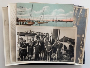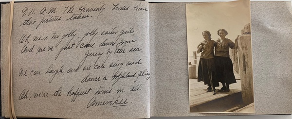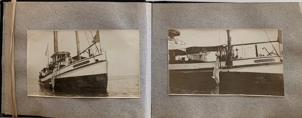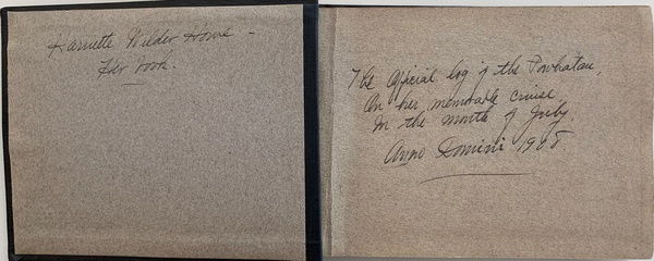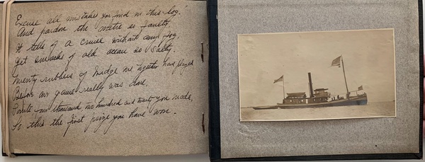 Home, Harriette Wilder. NP (Chesapeake, VA?): Harriette Wilder Home, 1908. First Edition. Oblong 8vo. Cloth Over Limp Boards. Travel Album. Near Fine/No Jacket - As Issued. np (48pp), 29 individual 3 ¼ x 5 ½" gelatin silver photographic illustrations. This is a hand assembled journal that consists of thirty-one pages of holographic script by passenger Harriette Wilder Home documenting a five day cruise on the ship SS Powhatan along the Virginia Coast in mid-July, 1908. Written in a 5 ¾ x 7 ¾" cloth album, The author jauntily details the map coordinates, meals, scenery, bridge-playing results and other pertinent events during her five day cruise. The text is intertwined amidst twenty-four tipped-in photographs taken during the voyage, with an additional five images and a 1908 postcard of a Maryland crabbing fleet laid in. "The Powhatan was originally was launched as the SS Yorktown February 10th, 1894, by Delaware River Iron Ship Building and Engine Works for the Old Dominion Steamship Company. The Navy purchased the Yorktown on April 21st, 1898, to be commissioned as the second USS Resolute, an auxiliary cruiser and transport that saw naval service during the Spanish-American War in 1898-1899. The Department of War acquired the ship on January 22nd, 1900, for service as the Army Transport (USAT) Rawlings. The Rawlings was then decommissioned and sold to the Merchants and Miners Transportation Company of Baltimore, Maryland on July 27, 1901, and renamed Powhatan", which leads us to Ms. Home - who has written "Harriette Wilder Home - / Her Book." in ink on the inside of the front board - and her 1908 Chesapeake Bay pleasure cruise. An age-appropriately most handsome example of this unique travel journal showing a bit of mild wear and occasional creases to the margins of some pages as well as silvering to some of the photographs. Inventory Number: 026940