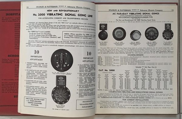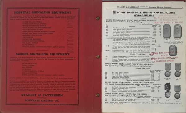 Stanley & Patterson. Adrian, MI. 1936 (1938).: Stanley & Patterson Division of Schwarze Electric Co.. Edition Not Stated - Later Printing. 4to. Brad-Bound Stiff Wrappers. Trade Catalogue. Very Good.. np (118pp), profusely illustrated in b&w. In a protective clear acetate dustwrapper. This is a 1936 salesman's trade catalogue issued by the Stanley & Patterson Division of the Schwarze Electric Co. of Adrian, Michigan. Bound in stiff wrappers and clasped with brass brads, it contains copiously illustrated entries showcasing the company's lines of electronic bells, buzzers, chimes, gongs, sirens, howlers, annunciators, alarm systems, relays, telephones, paging systems, loudspeakers, electric clocks, and the like. An internally bright, most handsome example bearing "Reprint June 1938" on the front cover and containing rubber ownership stamps from Stanley & Patterson's New England agent H.W. MacLeod & Co., The South Boston's Gorham Fire Equipment Co., and Academy Award winning Art Director Dean Tavoularis at the front showing some light wear, soiling, sunning, and creasing to its red printed covers. Inventory Number: 027005