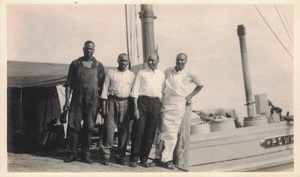 A 1908 VERNACULAR GELATIN SILVER PHOTOGRAPH OF FOUR AFRICAN-AMERICAN LABORERS ABOARD THE SS POWHATAN IN CHESAPEAKE BAY