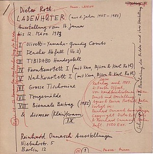 (ROTH, DIETER). Roth, Dieter.. Berlin: Verlag Agnes & Reiner Pretzell & Galerie Reinhard Onnasch, 1983. First Edition 1/3500. Square 8vo. Stapled Illustrated Wrappers. Artist Monograph. Fine.. 28pp, printed in two-color offset. Text in German. This is a quirky exhibition catalogue cum artist's book published in conjunction with a 1983 exhibition of Dieter Roth's works from the holdings of noted German gallerist and collector Reinhard Onnasch. Annotated - and subsequently revised here - in the artist's own hand, it contains Roth's commentary on the pieces shown. A most handsome example of this uncommon item stapled at the top left corner, as issued. Inventory Number: 022699
