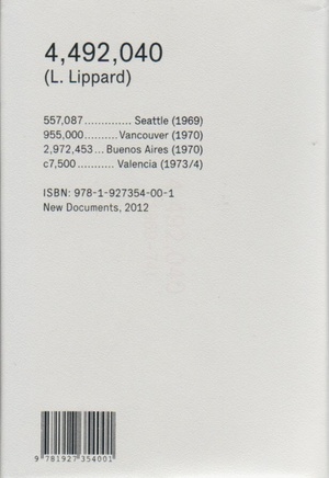 Lippard, Lucy R. & Jeff Khonsary, Editors. Vancouver, CANADA & Los Angeles: New Documents, 2012. First Edition 1/1000. 12mo. File Cards in Printed Wrapper. Exhibition Catalog. As New.. One hundred and seventy-nine 4 x 6" file cards printed monochrome offset recto and verso, profusely illustrated. With a bibliography and filmography. "4,492,040 is a facsimile reprint of a series of documents produced by curator Lucy R. Lippard. Drawn from material originally published between 1969 and 1974, 4,492,040 includes reprints of all four of the catalogs from Lippard’s hugely important "numbers shows" - a series of exhibitions named for the populations of the cities they were held in: 557,087 (Seattle, 1969), 955,000 (Vancouver, 1970), 2,972,453 (Buenos Aires, 1970), and c.7,500 (Valencia, CA, 1973/74). As with the originals, 4,492,040 is made up of a collection of loose notecards containing statements, documentation, and conceptual works by each artist, to be rearranged, filed, or discarded at will. This new edition is supplemented by a new afterword by Lippard". The four exhibitions' participants include Vito Acconci, Laurie Anderson, Carl Andre, Eleanor Antin, Siah Armajani, Keith Arnatt, Richard Artschwager, Art & Language (Terry Atkinson, David Askevold, Alice Aycock, David Bainbridge, Michael Baldwin, Harold Hurrell), John Baldessari, Robert Barry, Frederick Barthelme, Jennifer Bartlett, Gene Beery, Mel Bochner, Bill Bollinger, Jon Borofsky, Stanley Brouwn, Daniel Buren, Victor Burgin, Donald Burgy, Pierpaolo Calzolari, Rosemary Castoro, Don Celender, James Collins, Christopher C. Cook, Greg Curnoe, Hanne Darboven, Walter de Maria, Agnes Denes, Jan Dibbets, Christos Dikeakos, Rafael Ferrer, Gilbert & George, Dan Graham, Hans Haacke, Ira Joel Haber, Alex Hay, Michael Heizer, Eva Hesse, Nancy Holt, Douglas Huebler, Robert Huot, Richards Jarden, Stephen Kaltenbach, On Kawara, Edward Kienholz, Robert Kinmont, Joseph Kosuth, Christine Kozlov, John Latham, Barry Le Va, Sol LeWitt, Roelof Louw, Duane Lunden, Bruce McLean, Robert Morris, N.E. Thing Co. (Iain and Ingrid Baxter), Bruce Nauman, New York Graphic Workshop, George Nikoliadis, Dennis Oppenheim, John Perrault, Adrian Piper, Robert Rohm, Allen Ruppersberg, Ed Ruscha, Fred Sandback, George Sawchuck, Richard Serra, Randy Sims, Robert Smithson, Keith Sonnier, Athena Tacha, Mierle Laderman Ukeles, Jeff Wall, Lawrence Weiner, Ian Wilson, and Martha Wilson. A pristine, brand new complete set of all one hundred and seventy-nine loose cards sealed inside their printed wrapper in the publisher's clear plastic zip-lock pouch, as issued. 1-927354-00-5 Inventory Number: 027596