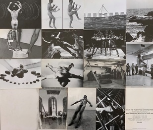 (STELARC). Stelarc. Various. 1976-1981.: Self-Published. First Editions. Oblong 12mo. Printed Postcards. Artist Multiples. Very Good - or Better.. Fifteen 4 1/8 x 5 7/8" cardstock postcards printed offset b&w, recto and verso. Text in English. This is a collection of fourteen photographically illustrated, self-published postcards documenting noted Cypriot-born, Australian-based artist Stelarc's public performances - primarily in Japan and Australia - between 1976 and 1981. A handsome group of these uncommon artist's multiples issued for the following performances: "Event for Stretched Skin (May 16th, 1976 - Tokyo)", "Event for Penetration / Extrapolation (August 14th, 1976 - Mexico City)", "Event for Stretched Skin No. 4 (August 8th, 1977 - Munich)", "Event for Inclined Suspension (January 7th, 1979 - Tokyo)", "Event for Amplified Tension (August 6th, 1979 - Tokyo)", "Pull Out / Pull Up Event for Self-Suspension (March 2nd, 1980 - Tokyo)", "Sitting / Swaying Event for Rock Suspension (May 11th, 1980 - Tokyo)", "Event for Obsolete Body (August 13th, 1980 - Melbourne)", "Up / Down: Event for Shaft Suspension (August 17th, 1980 - Melbourne)", "Tilted / Twisting Event for Cone Configuration (December 30th - Tokyo)", "The Third Hand. The Third Hand (May 8th, 1981 - Tokyo)", "Seaside Suspension: Event for Wind and Waves (May 30th, 1981 - Jogashima)", "Sculpture Space Suspension (August 16th, 1981 - Mexico City)", "Deca-Dance (November 15th, 1981 - Tokyo)", and "Curves / Event for Three Hands (December 28th, 1981 - Tokyo)". Inventory Number: 026265