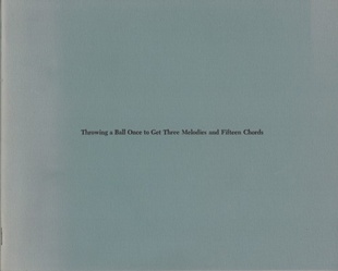 (BALDESSARI, JOHN). Baldessari, John. Irvine, CA: The Art Gallery of the University of California, Irvine, 1973. First Edition 1/2500. Oblong 8vo. Stapled Printed Wrappers. Artist's Book. Near Fine.. np (28pp), 15 b&w illustrations. Published in conjunction with a 1973 University of California, Irvine exhibition, this artist's book contains fifteen photographic images of noted Conceptual artist John Baldessari in the process of chucking a projectile that have been superimposed with colored musical staves to create three melodies and fifteen chords, as promised. A bright, most handsome copy showing a thin margin of barely perceptible sunning to the length of the spine. Inventory Number: 020629