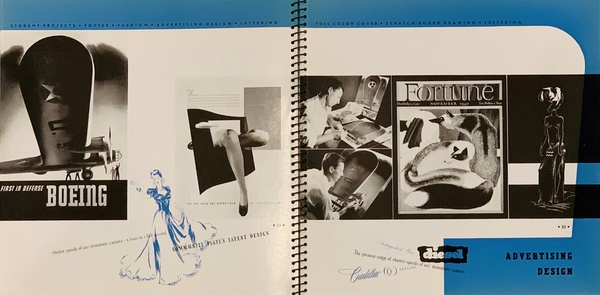 (ART CENTER COLLEGE OF DESIGN). Art Center School Staff. Los Angeles: The Art Center School, 1941. First Edition. Oblong 8vo. Spiral-Bound Illustrated Wraps. Educational Course Catalogue. Near Fine.. 72pp, profusely illustrated in duotone and b&w. Designed by students of The Art Center School with Harvey Thompson. In a protective clear acetate dustwrapper. This is the exceedingly stylishly designed catalogue of the 1941 academic offerings for Los Angeles' Art Center School. Founded in 1930, the renowned institution was one of Southern California's first comprehensive Art colleges. It relocated in 1976 to Pasadena, and became known as Art Center College of Design. Specializing in trade-oriented educational programs for students seeking careers in painting and illustration, advertising and graphic design, architecture, photography, motion picture craft, and industrial and automotive design, their faculty has always featured a stellar collection of professionals in these fields. Included here are Ansel Adams, Edward A, Adams, Fred R. Archer, Earl Baird, Lionel Banks, Edward Biberman, Clarence Bull, Will Connell, Thomas S. Curtis, Fred Dapprich, J.R. Davidson, James Doolittle, Paul Dorsey, Clarence K. Eaton, Elizabeth Franklin, Harwell Hamilton Harris, Frank Hewlett, Franklin B. Judson, Edward B. Kaminsky, Gordon B. Kaufmann, Charles Kerlee, Donald Biddle Keyes, Albert King, Nina Novinska, Charles Potts, R.M. Schindler, A.B. Shore, Chalmers C. Smith, Kem Weber, and many others. Designed by students and faculty in a modernist style reminiscent of the work of Lester Beall and Alvin Lustig, its eye-catching layout features numerous striking photomontages combining photography, illustration, and typography. An exceptionally bright, most handsome example of this exceedingly uncommon design object NUMBERED 598 (of an unstated edition) bearing the school's printed designation "This Book Presented to" followed by "Grace Mallon" in blue ink, as issued. Grace Elizabeth Mallon was an Art Center School student who went on to a career as a fine artist in the mold of her mentor, Millard Sheets, as well as working for Walt Disney, Universal Studios, Fairbanks Films, Churchill-Wexler Films, and Hanna-Barbera Studios. She participated in San Francisco's 1939 Golden Gate International Exhibition and is included in Milton Edan Hughes' comprehensive reference work "Artists in California 1786-1940." Inventory Number: 025945