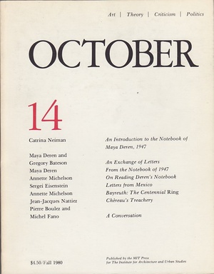(OCTOBER). Krauss, Rosalind, Douglas Crimp & Annette Michelson, Editors. Cambridge, MA & New York: MIT Press for the Institute for Architecture and Urban Studies, 1980. First Edition. 8vo. Printed Wrappers. Journal. Near Fine.. 120pp, illustrated in b&w. At the forefront of contemporary arts theory and criticism, "October" has for over thirty-five years focused critical attention on the contemporary arts and their various contexts of interpretation: film, painting, music, photography, performance, sculpture, literature. Contributions to this issue include: An Introduction to the Notebook of Maya Deren, 1947 - Catrina Neiman; An Exchange of Letters - Maya Deren and Gregory Bateson; From the Notebook of 1947 - Maya Deren; On Reading Deren's Notebook - Annette Michelson; Letters from Mexico - Sergei Eisenstein; Bayreuth: The Centennial Ring - Annette Michelson; Chereau's Treachery - Jean-Jacques Nattiez; A Conversation - Pierre Boulez and Michel Fano. A bright, most handsome example showing some light sunning to the red ink along the spine. ISSN 0162-2870 Inventory Number: 022859
