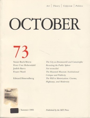 (OCTOBER). Krauss, Rosalind, Annette Michelson, Yve-Alain Bois, Benjamin H. D. Buchloh, Hal Foster, Denis Hollier, Silvia Kolbowski & Mignon Nixon, Editors. Cambridge, MA: MIT Press Journals, 1995. First Edition. 8vo. Printed Wrappers. Journal. Very Good.. 137pp, illustrated in b&w. At the forefront of contemporary arts theory and criticism, "October" has for over thirty-five years focused critical attention on the contemporary arts and their various contexts of interpretation: film, painting, music, photography, performance, sculpture, literature. Contributions to this issue include; The City as Dreamworld and Catastrophe - Susan Buck-Morss; Recasting the Public Sphere - Peter Uwe Hohendahl; Not Reconciled - Judith Barry; The Haunted Museum: Institutional Critique and Publicity - Frazer Ward; The Will to Motorization: Cinema, Highways, and Modernity - Edward Dimendberg. A handsome copy showing just a bit of light handling and the remnants of its bar code sticker on the front cover. It has been priced accordingly. 0162-2879 Inventory Number: 022360
