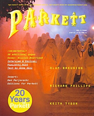 (PARKETT). Curiger, Bice, Editor. Zurich, SWITZERLAND: Parkett, 2004. First Edition. Small 4to. Illustrated Wrappers. Contemporary Art Periodical. Near Fine.. ca 250pp, profusely illustrated in color and b&w. Parallel Text in English and German. A handsome example of the seventy-first issue of this influential Swiss visual arts quarterly. 3-907582-31-4 Inventory Number: 011235
