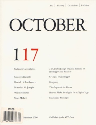 (OCTOBER). Krauss, Rosalind, Annette Michelson, George Baker, Yve-Alain Bois, Benjamin H.D. Buchloh, Leah Dickerman, Hal Foster, Denis Hollier, Mignon Nixon, Malcolm Turvey & Lisa Pasquariello, Editors. Cambridge, MA: MIT Press Journals, 2006. First Edition. 8vo. Printed Wrappers. Journal. Fine.. 126pp, illustrated in b&w. At the forefront of contemporary arts theory and criticism, "October" has for over thirty-five years focused critical attention on the contemporary arts and their various contexts of interpretation: film, painting, music, photography, performance, sculpture, literature. Contributions to this issue include: The Anthropology of Exit: Bataille on Heidegger and Fascism - Stefanos Geroulanos, Critique of Heidegger - Georges Bataille, Company - Daniel Heller-Roazen, The Gap and the Frame - Branden W. Joseph, How to Make Analogies in a Digital Age - Whitney Davis, and Suspicious Packages - Yates McKee. A most handsome copy. 0-262-75267-0 Inventory Number: 021231