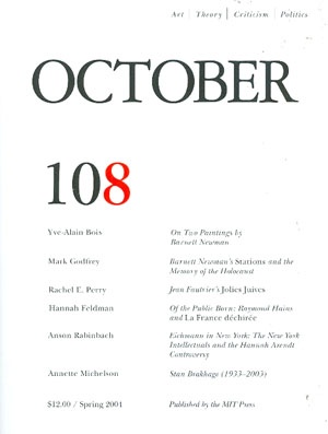 (OCTOBER). Krauss, Rosalind, Annette Michelson, George Baker, Yve-Alain Bois, Benjamin H.D. Buchloh, Leah Dickerman, Hal Foster, Denis Hollier, Mignon Nixon, Malcolm Turvey, Catherine de Zegher & Lisa Pasquariello, Editors. Cambridge, MA: MIT Press Journals, 2004. First Edition. 8vo. Printed Wrappers. Journal. Near Fine.. 115pp, illustrated in b&w. At the forefront of contemporary arts theory and criticism, "October" has for over thirty-five years focused critical attention on the contemporary arts and their various contexts of interpretation: film, painting, music, photography, performance, sculpture, literature. Contributions to this issue include: On Two Paintings by Barnett Newman - Yve-Alain Bois; Barnett Newman's Stations and the Memory of the Holocaust - Mark Godfrey; Jean Fautrier's Jolies Juives - Rachel Perry; Of the Public Born: Raymond Hains and La France déchirée - Hannah Feldman; Eichmann in New York: The New York Intellectuals and the Hannah Arendt Controversy - Anson Rabinbach; Stan Brakhage (1933-2003) - Annette Michelson. A handsome copy. 0-262-75258-1 Inventory Number: 012415