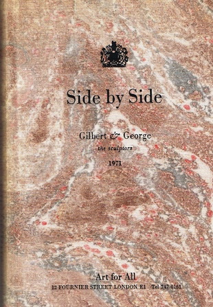 (GILBERT & GEORGE). Gilbert & George. London, Cologne, GERMANY & New York: Art For All & Konig Brothers, 1972. First Edition 1/600. 8vo. Debossed Linen Over Boards. Artists' Book. Fine/No Jacket - As Issued. 176pp, 85 b&w illustrations. In a protective clear acetate dustwrapper. Limited to six hundred copies, the beautifully bound "Side by Side" is the very first artists' book by British conceptual duo, "the sculptors" Gilbert & George. It contains three chapters entitled "With Us in the Nature", "A Glimpse Into the Abstract World", and "The Reality in Our Living" which alternate pages of text and illustration and that "together represent a contemporary sculpture novel". A brand new, most handsome example in lovely hand-marbled boards of the 1972 first edition of this exceedingly uncommon item SIGNED "Gilbert & George" in red on the foreword AND NUMBERED (No. 85 of 600) on the inside rear cover, as issued. Inventory Number: 025705