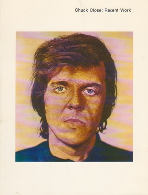 (CLOSE, CHUCK). Close, Chuck & Gail R. Scott. Los Angeles: Los Angeles County Museum of Art, 1971. First Edition. 12mo. Pictorial Wrappers. Artist Monograph. Fine.. One continuous 7 ½ x 11 ½" glossy cardstock sheet printed offset recto and verso, folded neatly in half to make 4pp, 1 color illustration. With an exhibition checklist. This is the slender four page brochure published in conjunction with a 1971 Los Angeles County Museum of Art Ahmanson Gallery exhibition of nine recent portraits by the still Bykert Gallery-affiliated Chuck Close. A glossy, most handsome example of this exceedingly uncommon ephemeral item - only four copies are currently cited in OCLC WorldCat - that was the only printed documentation of the event. Inventory Number: 024813