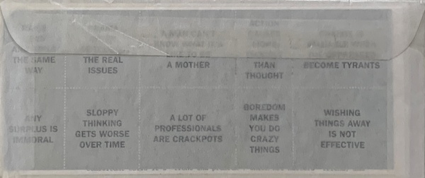(HOLZER, JENNY). Holzer, Jenny & Marianne Weems. New York: Art Matters, 1995. First Edition. Small Oblong 8vo. Printed Paper in an Envelope. Artist's Multiple. As New.. One 3 ½ x 8 ½" mucilage-backed paper sheet printed offset recto only, perforated to make ten individual stamps + two machine-folded 11 x 8 ½" offset sheets printed in duotone offset, recto and verso. This is the set of black on silver postage-style stamps reproducing ten phrases drawn from Jenny Holzer's "Truisms" series produced to be included in with 1995 fundraising letter to benefit the New York non-profit arts organization, Art Matters. The artist's thought-provoking phrases are RAISE BOYS AND GIRLS THE SAME WAY, DRAMA OFTEN OBSCURES THE REAL ISSUES, A MAN CAN'T KNOW WHAT IT'S LIKE TO BE A MOTHER, ACTION CAUSES MORE TROUBLE THAN THOUGHT, CHANGE IS VALUABLE WHEN THEY OPPRESSED BECOME TYRANTS, ANY SURPLUS IN IMMORAL, SLOPPY THINKING GETS WORSE OVER TIME, A LOT OF PROFESSIONALS ARE CRACKPOTS, BOREDOM MAKES YOU DO CRAZY THINGS, and WISHING THINGS AWAY IS NOT EFFECTIVE. A brand new, unopened example of this artist's multiple with all printed enclosures present in the Art Matters glassine envelope, as issued. Inventory Number: 027124