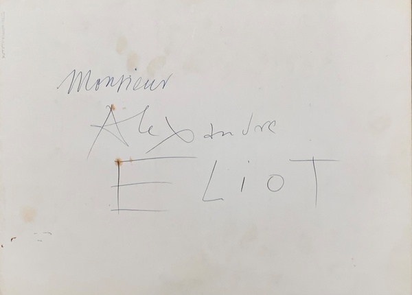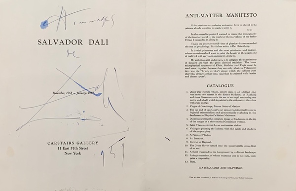 (DALI, SALVADOR). Dali, Salvador. New York: Carstairs Gallery, 1958. First Edition. Large 4to. Stapled Illustrated Wrappers. Artist Monograph. Very Good -.. One 14 x 21" cardstock sheet printed offset recto and verso folded in half vertically to make 14 x 11 ½", 4pp, 1 b&w cover illustration. Cover Designed by Salvador Dali. With an exhibition checklist. In a protective clear acetate dustwrapper. This is the slender four page catalogue published in conjunction with Salvador Dali's 1959 exhibition of thirteen watercolors and drawings at New York's Carstairs Gallery. Stating "This, my best exhibition, I dedicate to Gala, my Sistine Madonna", it features a cover illustration by the Surrealist icon along with his brief "Anti-Matter Manifesto". A most presentable example of this exceedingly uncommon item additionally BOLDLY INSCRIBED "Monsieur Alexandre ELIOT" in blue ballpoint pen across the rear cover plus "Hommages de Dali / 1959" in blue fountain pen on the inside front cover showing light soiling and spotting, some stray pigment marks, and minor insect damage to the covers. Noted late historian, critic, and author Alexander Eliot - for whom this was inscribed - was the "Time" magazine art editor between 1945 and 1960 and a close friend of the artist. It has been priced accordingly. Inventory Number: 025563
