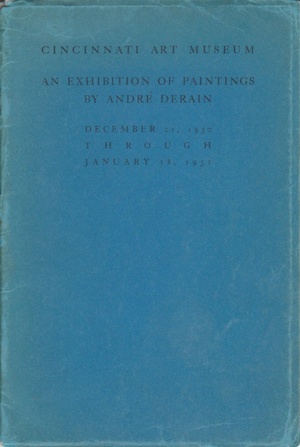 (DERAIN, ANDRE). Cincinnati Art Museum Staff. Cincinnati, OH: Cincinnati Art Museum, 1930. First Edition. 8vo. Stapled Printed Wrappers. Artist Monograph. Good -.. np (36pp), 21 b&w illustrations. With an exhibition checklist. In a protective clear acetate dustwrapper. This is the catalogue published in conjunction with a 1930 Cincinnati Art Museum exhibition of forty-six paintings executed between 1913 and 1929 by the renowned French pioneer of the Fauve movement, Andre Derain. An internally handsome example of this exceedingly uncommon item whose wrappers show some overall wear, discoloration, and chipping to the extremities of the spine along with oxidation to the staples that has stained the pages just a bit at the gutter. It has been priced accordingly. Inventory Number: 023741