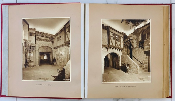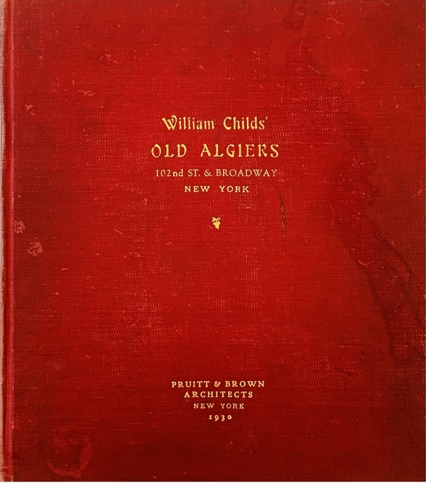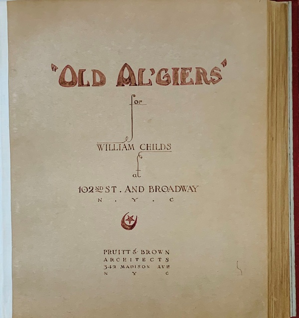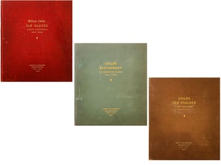(CHILDS RESTAURANT). Pruitt & Brown Architects. New York: Pruitt & Brown Architects, 1930. First Editions. Folio. Gilt-Stamped Buckram. Architecture Monographs. Near Fine/No Jackets - As Issued. 36pp + 48pp + 72pp, each profusely illustrated with original 7 ¼ x 9 ½" photographs and contemporary publication clippings. In protective clear acetate dustwrappers. This is a group of three unique, lavishly hand-assembled 14 x 12 ½" project documentation books produced in 1930 by Pruitt & Brown Architects to showcase their design work for recently opened showpieces for the Childs Restaurant chain. Founded in New York in the 1880s, Childs became one of the first national dining chains, with over one hundred venues at its height. The firm's ownership changed hands just as the US slipped into the Great Depression, and Childs optimistically opened a series of elegant Manhattan dining establishments each differentiated by a distinct architectural theme presented as if one were stepping onto a glamorous Hollywood back lot set. These hefty volumes have been produced in the manner of a scrapbook with original sepia-toned silver gelatin photographs by the Peyser & Patzig firm affixed to thick linen-hinged pages throughout liberally supplemented by menus, correspondence, and newspaper, magazine, and press coverage of the projects. The first is devoted to the Childs Restaurant at 425 Lexington Avenue which was a jaw-dropping showpiece of Art Deco elegance. The second covers Childs "Old England" at 9 East 40th Street, which presented a Robin Hood-like décor. The third - and most comprehensive of these books - details William Child's "Old Algiers" at 102nd Street and Broadway, which simulated an exotic night at the Kasbah. The three are bound in differing hues of buckram over boards with still-bright gilt-stamped titles on their front covers and spines. Each is internally in Fine condition, and bears a typed label on the inside front board noting that the volume was issued by the Pruitt & Brown Architects office at 342 Madison Avenue for use at the firm's Charlottesville, VA office. The exteriors show varying degrees of wear, rubbing, and some light discoloration, but are still sound and in no way detract from the remarkable contents. These are stunning, near-unique documents of another time, place, and dining experience that must be seen in hand to be fully appreciated. Inventory Number: 026957