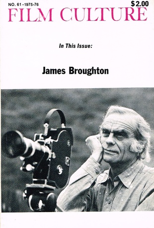 (FILM CULTURE) (BROUGHTON, JAMES). Mekas, Jonas & P. Adams Sitney, Editors. New York: Film Culture, 1975. First Edition. 8vo. Pictorial Wrappers. Film Journal. Near Fine.. 112pp, illustrated in b&w. Jonas Mekas' influential "Film Culture" was New York's preeminent journal devoted to avant-garde cinema and the voice of the international independent filmmaking community of the fifties, sixties, and seventies. This sixty-first installment from 1975 spotlights the achievements of the iconoclastic American independent filmmaker and poet James Broughton. It includes an interview with Broughton by editors Jonas Mekas and P. Adams Sitney, contributions by Kermit Sheets and Clark McKowen, and many of Broughton's own writings. A most handsome example. ISSN 0015-1211 Inventory Number: 025670