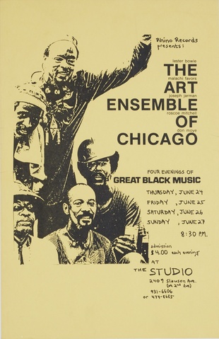 (ART ENSEMBLE OF CHICAGO, THE). Art Ensemble of Chicago, The. Los Angeles: Rhino Records & The Century City Educational Arts Project, 1976. First Edition. Small Folio. Printed Sheet. Concert Poster. Fine.. One 17 x 11" sheet printed offset, recto only. This is the striking poster for a series of June 1976 Art Ensemble of Chicago performances presented in Los Angeles by the Rhino Records store and The Century City Educational Arts Project. The concerts marked the first time the AACM stalwarts had brought their Great Black Music to the city, playing two completely different sets each of four evenings at the former ballroom that served as David Hammons' studio. A most handsome, guaranteed vintage example of the larger format version of this uncommon ephemeral item (featuring lettering by noted percussionist Alex Cline) of which only one hundred were printed. We know this because I personally produced these concerts and the posters! Inventory Number: 027468