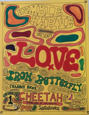 NOBLE RICHARDSON: A UNIQUE, HAND PAINTED 1967 FAN ART POSTER FOR "HUMBLE HARVE PRESENTS LOVE, IRON BUTTERFLY, AND CHAMBER (SIC) BROS AT THE CHEETAH"