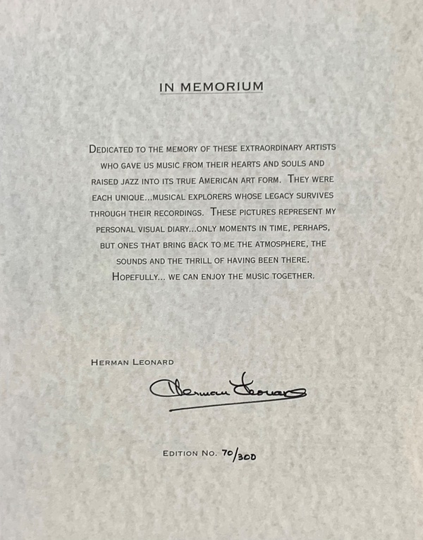 IN MEMORIUM BY HERMAN LEONARD - SIGNED AND NUMBERED PORTFOLIO OF TWELVE PRINTS LIMITED TO THREE HUNDRED COPIES