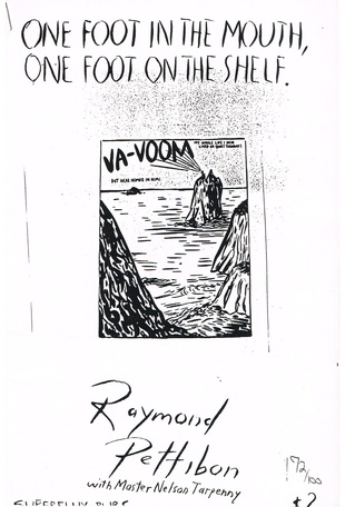 (PETTIBON, RAYMOND). Pettibon, Raymond & Nelson Tarpenny. NP: Superflux Publications, 1992. First Edition 1/100. 8vo. Stapled Illustrated Wrappers. Artist's Book. Near Fine.. np (36pp), 18 b&w illustrations. In a protective clear acetate dustwrapper. Raymond Pettibon first came to prominence during the late-seventies with his raw, literary-inflected imagery for Black Flag, Sonic Youth, and SST Records. Over the subsequent decades, the erstwhile Southern California artist has deservedly become an international contemporary art icon. Limited to one hundred copies, "One Foot in the Mouth, One Foot on the Shelf" is his 1992 Superflux-published artist book cum 'zine collaboration with "Master" Nelson Tarpenny that reproduces eighteen psychologically-charged drawings. A most handsome, guaranteed authentic example of this exceedingly uncommon Pettibon tour de force (entry number one hundred and one in Uwe Koch and Roberto Ohrt's "A Catalogue Raisonné of Artists' Books by Raymond Pettibon, 1978-98") HAND NUMBERED "72/100" in black ink by the artist on the front cover, as issued. Inventory Number: 025700