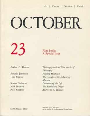 (OCTOBER). Copjec, Joan, Douglas Crimp, Rosalind Krauss & Annette Michelson, Editors. Cambridge, MA & New York: MIT Press for the Institute for Architecture and Urban Studies, 1982. First Edition. 8vo. Printed Wrappers. Journal. Near Fine.. 166pp, illustrated in b&w. At the forefront of contemporary arts theory and criticism, "October" has for over thirty-five years focused critical attention on the contemporary arts and their various contexts of interpretation: film, painting, music, photography, performance, sculpture, literature. Contributions to this special thematic issue devoted to film books include: Philosophy and/as Film and/as if Philosophy - Arthur C. Danto; Reading Hitchcock - Fredric Jameson; The Anxiety of the Influencing Machine - Joan Copjec; Documenting the Left - Stuart Liebman; The Formalist's Dreyer - Nick Browne; Address to the Heathen - Noel Carroll. A handsome example showing just a bit of light wear and soiling. 0-262-76013-4 Inventory Number: 023864