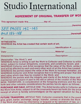 STUDIO INTERNATIONAL: APRIL 1971 (VOLUME 181, NUMBER 932) - FEATURING SETH SIEGELAUB AND ROBERT PROJANSKY'S "THE ARTIST'S RESERVED RIGHTS TRANSFER AND SALE AGREEMENT"