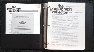 (PHOTOGRAPH COLLECTOR, THE). Persky, Robert S., Editor. New York. 1980-1984.: The Photograph Collector's Newsletter Ltd.. First Edition. 4to. Printed Wrappers. Photography Newsletter. Near Fine or Better.. Each 8-16pp, no illustrations. "The Photograph Collector: The Newsletter of Photography as Art and Investment" is the slender yet highly important monthly compendium of news of photographic gallery sales and exhibitions, Museum acquisitions, auctions, edition and portfolio releases, and book reviews first published in 1980 that continues to this day. This run is comprised of forty-five of the first forty-six issues (it is lacking only Volume II, No. 2 - October 15, 1980), and is a deeply insightful reference to the evolution of the modern photographic marketplace at the beginning of the eighties. A most handsome, well preserved set whose individual numbers have been hole-punched and stored in a vintage National black vinyl three-ring binder that contains an additional twenty ephemeral items and enclosures from the publisher (including "The State of New York Multiples Disclosure Law" pamphlet and several "Marketreach©" listings of photographs for sale) laid into its front pocket. ISSN 0271-0838 Inventory Number: 022502