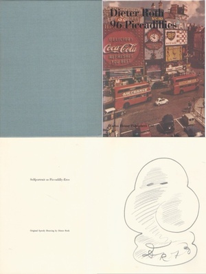 (ROTH, DIETER) aka (ROT, DITER). Roth, Dieter & Richard Hamilton. Introduction by Dieter Schwarz. Hansjorg Mayer & Dieter Roth, Editors. Stuttgart, GERMANY & London: Edition Hansjorg Mayer & Eaton House Publishers, Ltd., 1977. First Edition 1/200 Deluxe. Small 4to. Cloth in Jacket, Slipcased. Catalogue Raisonné. Fine/Fine. np, 96 color illustrations. Text in German and English. Issued in 1977 as the thirty-sixth volume of Edition Hansjorg Mayer's ambitious project of documenting the prolific artist book output of Dieter Roth, "96 Piccadillies" reproduces each of ninety-six commercial picture postcards of London's historic Piccadilly Circus altered during the seventies by Roth - some in conjunction with his frequent collaborator, Richard Hamilton. A most handsome example of this uncommon item from the deluxe slipcased edition limited to two hundred unnumbered copies (entry number I.3 cited on pages 210-211 of Dirk Dobke's "Dieter Roth in Print: Artist's Books / Kunstlerbucher") each with AN ORIGINAL "SPEEDY DRAWING" entitled "Selfportrait as Piccadilly-Eros" SIGNED AND DATED "D R 1978" in pencil laid in, as issued. Inventory Number: 022481