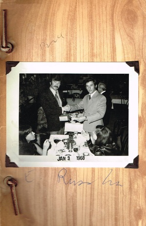 (RUSCHA, EDWARD) (BENGSTON, BILLY AL). Bengston, Billy Al & Edward Ruscha. Los Angeles: Self-Published by the Authors, 1968. First Edition 1/1000. 8vo. Wrappers with a Mounted Photo. Artists' Book. Good +./No Jacket - As Issued.. np (32pp), profusely illustrated in monochrome. Designed by Edward Ruscha. In a protective clear acetate dustwrapper. "Business Cards" is the innovatively designed and bound collaborative artists' book cum objet published in 1968 by Ed Ruscha and Billy Al Bengston. Limited to one thousand unique copies, it details in photographs by Ken Price and Larry Bell the process of the two artists designing their business cards, and the "presentation dinner" at Beverly Hills' The Bistro of the finished product(s). A most presentable example of the first and only edition of this uncommon item (entry B7 in Siri Engberg's "Edward Ruscha: Editions 1959-1999" which is also cited on pages 198-201 of The Hasselblad Center's "The Open Book") SIGNED "Bill" in black ink and "E. Ruscha" in blue ink on the front cover with its latigo leather thong complete and unbroken, the cover photograph present, and both cards stapled to the recto of the rear leaf, as issued, showing overall wear and creasing along the spine and edges of its faux wood veneer wrappers. In addition there is a thin margin of soiling along the top edge of the inside covers. It has been priced accordingly. Inventory Number: 025607