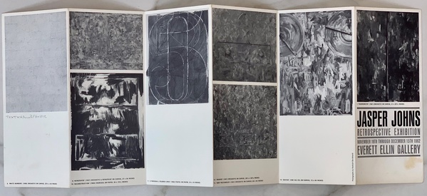 (JOHNS, JASPER). Ellin, Everett. Los Angeles: Everett Ellin Gallery, 1962. First Edition. Narrow 8vo. Folded Printed Paper Sheet. Artist Monograph. Near Fine.. One 18 x 23" sheet printed offset recto only machine-folded in twelfths to make 9 x 4", np (12pp), 14 b&w illustration. This is the uniquely designed brochure cum catalogue published in conjunction with a November 1962 Los Angeles gallery exhibition of fourteen paintings and works on paper executed by Jasper Johns between 1957 and 1962. The show - billed here as a retrospective - was the artist's first West Coast showing, and this is Johns' very first monographic publication. A most handsome example of this uncommon (only five copies are currently cited in OCLC WorldCat) ephemeral item showing a small brown spot near the bottom of the front panel. Inventory Number: 027283