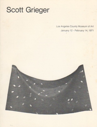 (GRIEGER, SCOTT). Grieger, Scott & Maurice Tuchman. Los Angeles: Los Angeles County Museum of Art, 1971. First Edition. 12mo. Illustrated Wrappers. Artist Monograph. Near Fine.. One continuous 7 ½ x 11 ½" cardstock sheet printed offset recto and verso, folded neatly in half to make 4pp, 1 b&w illustration. With an exhibition checklist. This is the slender four page brochure published in conjunction with a 1971 Los Angeles County Museum of Art Ahmanson Gallery exhibition of five recent "combination" works by Scott Grieger. Expanding on his earlier "Impersonations" series, the Los Angeles-based artist takes aim here at prevailing luminaries and tropes of Pop, Conceptual and Minimal Art with five works that marry the iconic imagery of Frank Stella with Donald Judd, Robert Morris with Larry Poons, Morris Louis with Sol LeWitt, Barnett Newman with Frank Stella, and Jasper Johns with Donald Judd to amusing effect. A brand new, pristine example of this exceedingly uncommon ephemeral item - only two copies are currently cited in OCLC WorldCat - that was the only printed documentation of the event. Inventory Number: 024815