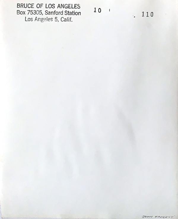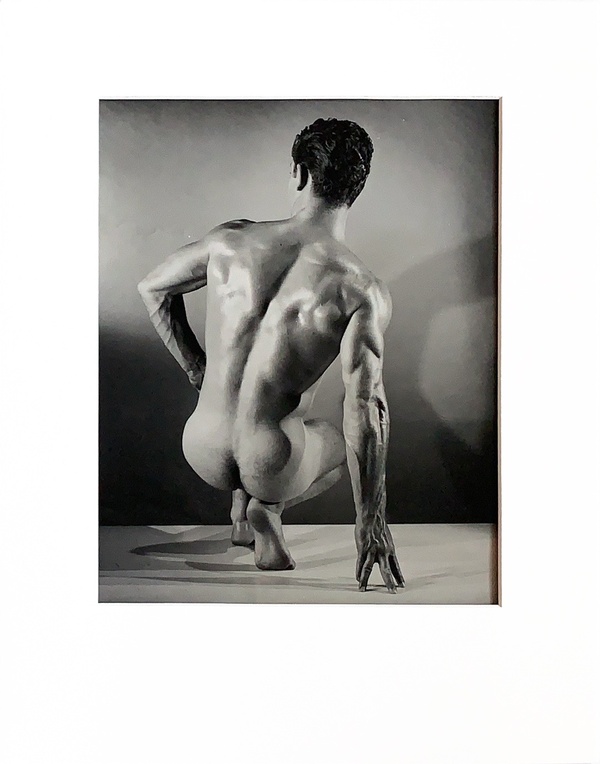 (BRUCE OF LOS ANGELES). Bellas, Bruce aka Bruce of Los Angeles. Los Angeles. ND: Bruce of Los Angeles. First Edition. 4to. Silver Gelatin Photograph. Near Fine.. One 8 x 10" silver gelatin print printed recto only, mounted with archival photo corners in a heavy white 11 x 14" beveled mat. This is a classic male physique photograph by Bruce Bellas - better known as Bruce of Los Angeles - picturing the nude, dramatically lit muscular model John Hackett posing in Bruce's studio. A bright, most handsome vintage silver gelatin print on heavy fiber-based paper bearing the stamp BRUCE OF LOS ANGELES / Box 73505, Sanford Station / Los Angeles 5, Calif." in black ink on the verso along with the name of John Hackett handwritten in pencil along the bottom edge showing a bit of browning of the emulsion along the lower margin of the recto not affecting the image. Inventory Number: 026270