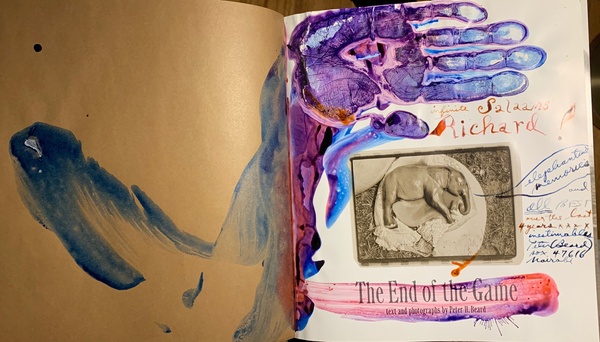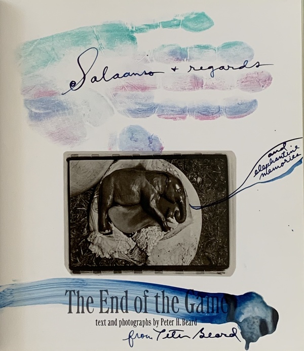 (BEARD, PETER). Beard, Peter Hill. Foreword by Joseph Murumbi. San Francisco: Chronicle Books, 1988. First Edition Thus, Later Printing. 4to. Cloth in Pictorial Dust Jacket. Photography Monograph. Fine/Near Fine. np, profusely illustrated in duotone. Designed by Ruth Ansel. "The End of the Game" was Peter Beard's prescient first book. Originally subtitled "The Last Word From Paradise: A Pictorial Documentation of the Origins, History & Prospects of The Big Game in Africa", it weaves his own photographs with vintage historical images into a narrative chronicle of the European exploration and exploitation of The Dark Continent, and the ensuing destruction of much of its native wildlife. A brand new, most handsome example of the second printing of the 1988 Chronicle books hardbound edition of this classic photobook (whose 1965 first edition is cited on pages 208-209 of The Hasselblad Center's "The Open Book" and pages 170-171 of "The Book of 101 Books") with a UNIQUE, BOLDLY SIGNED FULL PAGE INSCRIPTION "Salaams + regards / and elephantine memories / from Peter Beard" in blue ink WITH A MULTI-COLORED INK HAND PRINT AND WATERCOLOR FLOURISH across the entire half title page showing just a bit of light sunning along the spine. PLEASE NOTE: This "Sample" copy is NOT SIGNED by Peter Beard! 0-87701-521-X Inventory Number: 026365