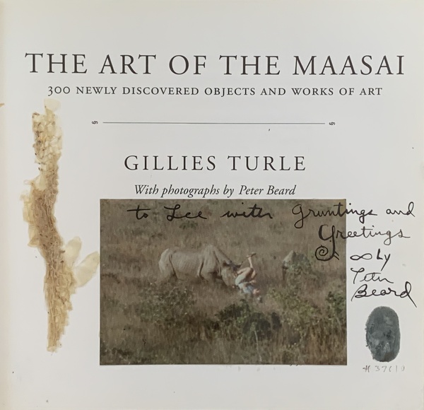 (BEARD, PETER). Turle, Gillies, Mark Greenberg & Peter Beard. New York: Alfred A. Knopf, Inc., 1992. First Edition. 4to. Cloth in Pictorial Dust Jacket. Photography Monograph. Fine/Fine. 164pp, 115 b&w and 80 color illustrations. Designed by Virginia Tan. "The Art of the Maasai" presents for the first time three hundred extraordinary ceremonial artifacts - discovered by Gillies Turle and never before seen outside the villages to which they belong - that were created over many generations by members of the Maasai tribe of Kenya. What makes their discovery particularly exciting is that high art has been found in a part of the world in which, until now, it was believed no art had ever been created. The ceremonial objects brought together here are extraordinary, and Peter Beard's photographs of them are in themselves works of art. This is a book whose publication is an event in the worlds of art and African culture". A brand new, most handsome example of the 1992 Alfred A. Knopf first hardbound edition additionally BOLDLY SIGNED AND INSCRIBED "to Lee with gruntings and / greetings / (infinite)Ly / Peter / Beard" in black ink across the title page with Peter Beard's thumbprint in dark grey ink under which he has annotated "#37610" OVER A COLLAGED 4 x 6" color c-print from the sequence of images of the photographer famously being tossed by a charging Rhinoceros along with a piece of snakeskin. 0-394-58323-X Inventory Number: 026349